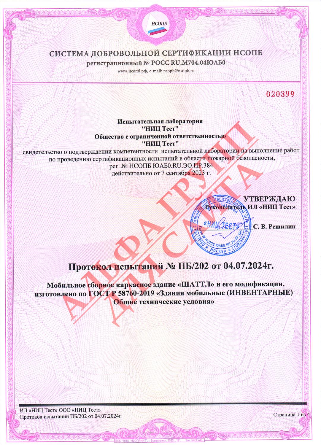 Протокол испытаний пожарной безопасности капсульный дом ШАТТЛ